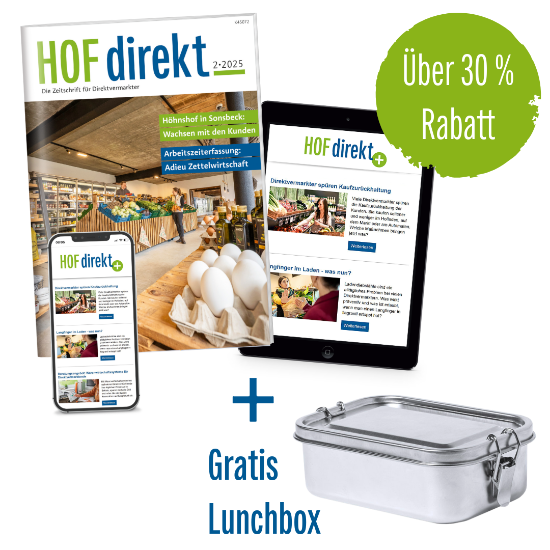 Vertrauensgarantie: Falls Sie das HOFdirekt Plus doch nicht weiternutzen möchten, senden Sie bitte eine Mitteilung an HOFdirekt, Leserservice, 48114 Münster. Die Lieferung bzw. Nutzung wird dann sofort und ohne weitere Verpflichtung eingestellt. Oder Sie nutzen das HOFdirekt Plus-Paket ohne Risiko weiter und können Ihr Abonnement jederzeit kündigen. Zu viel bezahlte Beträge erhalten Sie zurück. Jahresbezugspreis HOFdirekt Plus: 122,40 € (Preis einschließlich Versandkosten und MwSt., gültig für 2025). Die Bestellung erfolgt im Geltungsbereich unserer AGBs und Datenschutzhinweise. Wir verwenden die Daten Ihrer Bestellung, um Sie gelegentlich über ähnliche Angebote zu informieren. Dem können Sie jederzeit beim Verlag widersprechen.